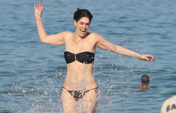 Ao lado dela também estava Paula Lavigne. A produtora bem que tentou entrar no mar, mas parece que a temperatura da água não estava convidativa.